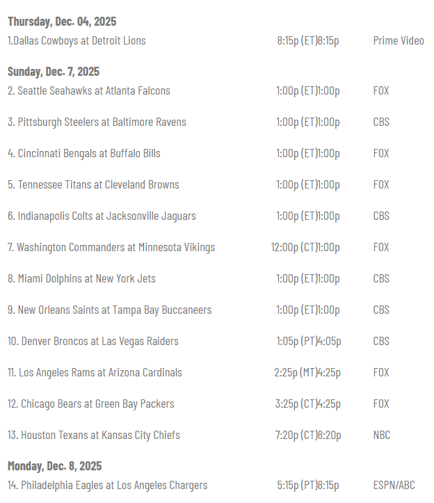12. Chicago Bears at Green Bay Packers |